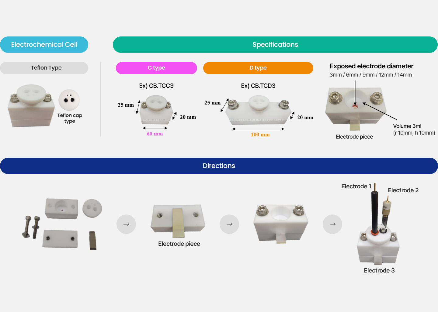 | CB.TCC3 | Electrochemical Cell ( 3 ml, Exposed electrode diameter ∅ 3 mm ) | 140,000 | 1/Ea. |